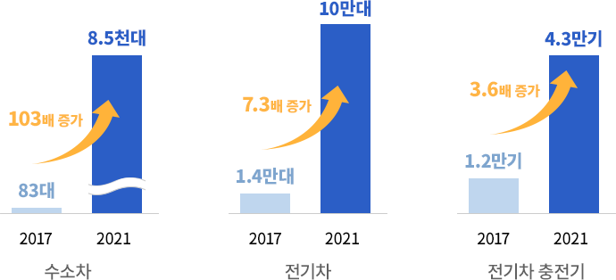전기·수소 충전소를 크게 늘리는 등 사용자의 편의도 챙겼습니다. 전기차 충전기를 2016년 약 2,000기에서 2021년 약 7만 2,105기로 확대했고, 수소충전소는 2016년 9기에서 2021년 100기로 확충했습니다. 인근 주유소에서 휘발유·경유를 넣는 것처럼 전기·수소차를 쉽게 충전할 수 있는 환경을 만들고 있는 것입니다.