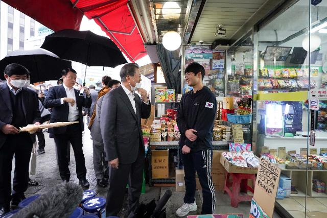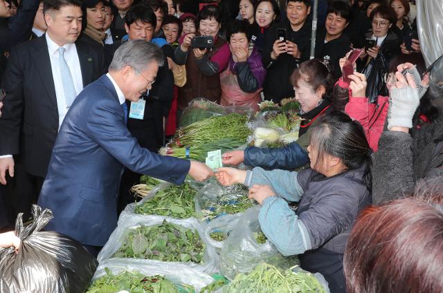 문재인 대통령이 지난해 3월 대구 칠성시장을 찾아 상인들의 애로사항을 경청한 뒤 시장에서 봄나물을 구입하고 있다. 청와대사진기자단