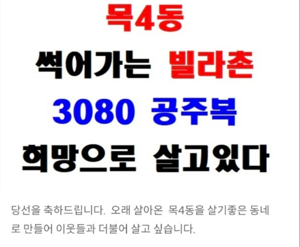 당선을 축하합니다 목4동을 살기좋은 동네로만들어 이웃과 더불어 살고싶습니다