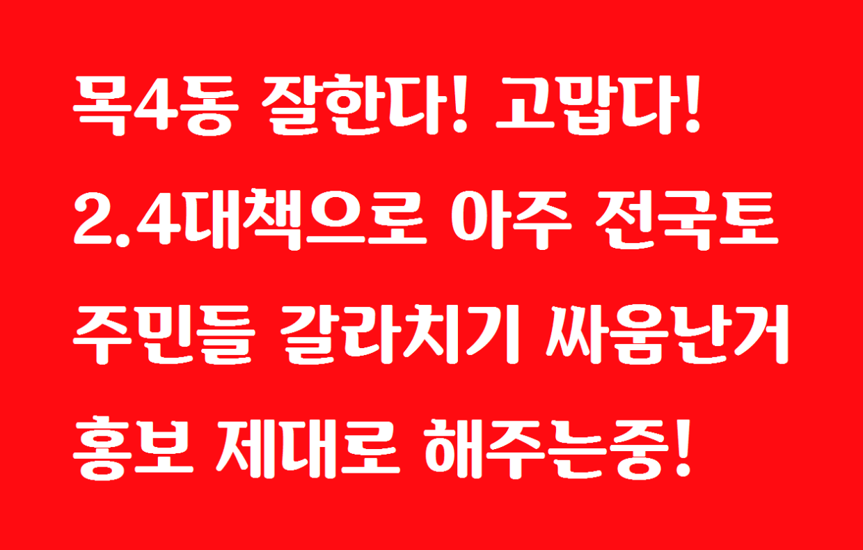 고맙다. 덕분에 2.4대책 주민갈라치기 삶의터전이 전쟁터가된것을 인수위가 적나라하게 보게생겼다.반대주민이 암걸리겠다싶잖아.
