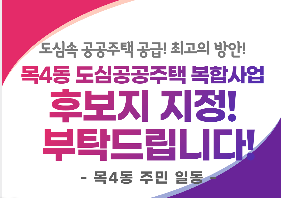 윤석열 대통령 당선인님. 양천구 목4동의 재개발에 관심을 가져주세요. 원주민들이 더 이상 열악한 환경에서 거주하지 않도록 공공주택복합사업에 지정될 수 있도록 힘을 실어주세요.