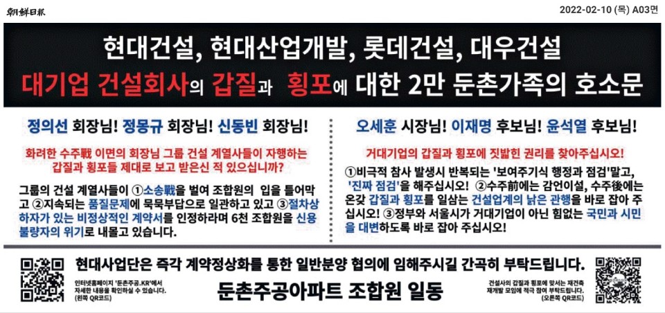현대시공단이 둔촌공사현장을 중단하지 않고 진정으로 협상에 임하도록 도와주시기를 부탁드립니다.