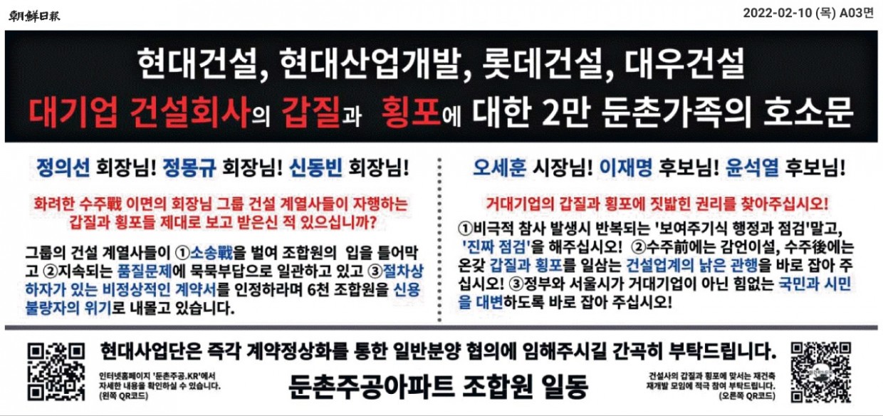 둔촌 주공 재건축현장 시공사의 횡포와 겁박을 멈추게 해주세요