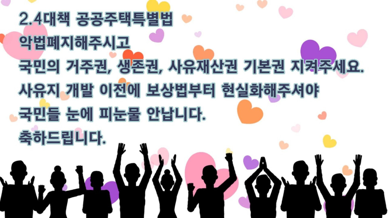 윤석열대통령님의 당선을 너무나 간절히 바라던 국민중 한사람입니다. 진심으로 축하드립니다. 토지강제수용이라는 공산당식 정책인 3080+도심공공주도복합사업을 반드시 폐기시켜주