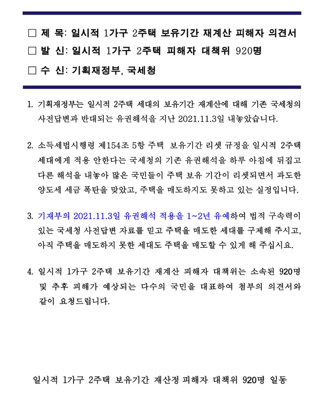 일시적2주택 보유기간 리셋 철폐 요청(기재부 21년 11.2 유권해석)