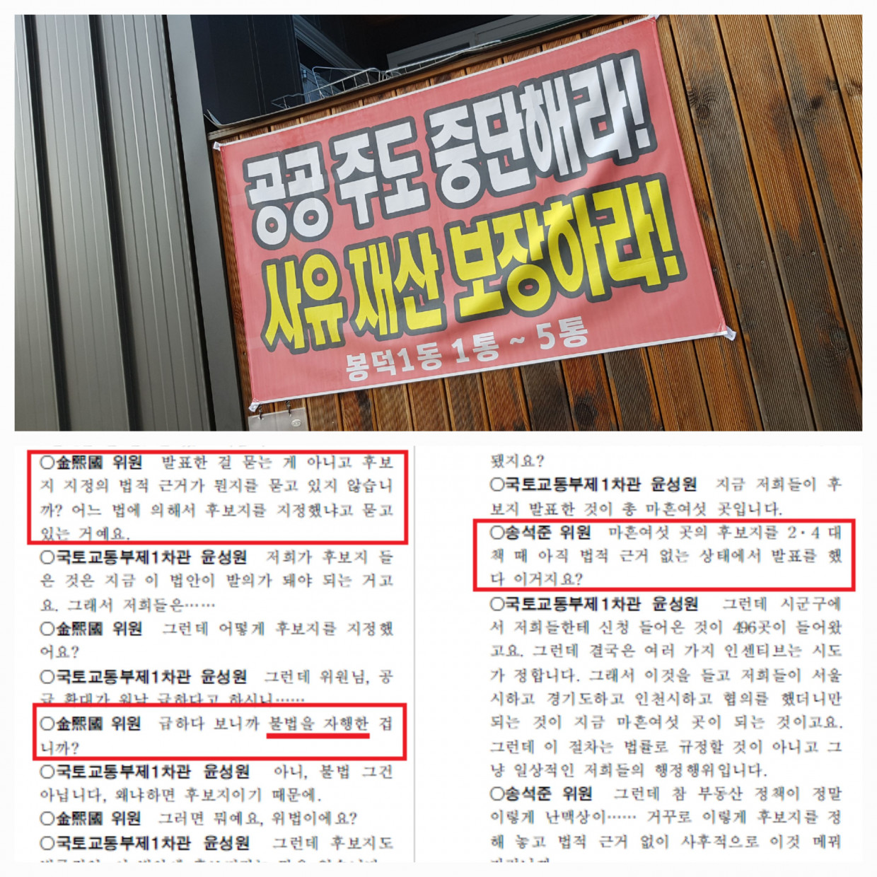 법적근거도 없이 국토교통부에서 2021.5.12 봉덕동을 후보지로 선정 발표하고 (원천무효임 직권남용 사유재산권 침해 등) 졸속으로 추진된 행정행위의 문제가 이미 드러난 점이며 (국토교통소위 2021.6.15 6.14 참조 공공주택특별법 개정 2021.7.20 참조 공공주택특별법 시행 2021.9.21) 21세기 자유민주주의 자본주의 대한민국에서 사유재산권 생존권 거주자유권 행복추구권 등 국민권익을 침탈 강탈하는 반민주주의적 북괴 공산 집단이나 하는 3080부동산 정책의 적폐를 즉시 청산해 주십시요